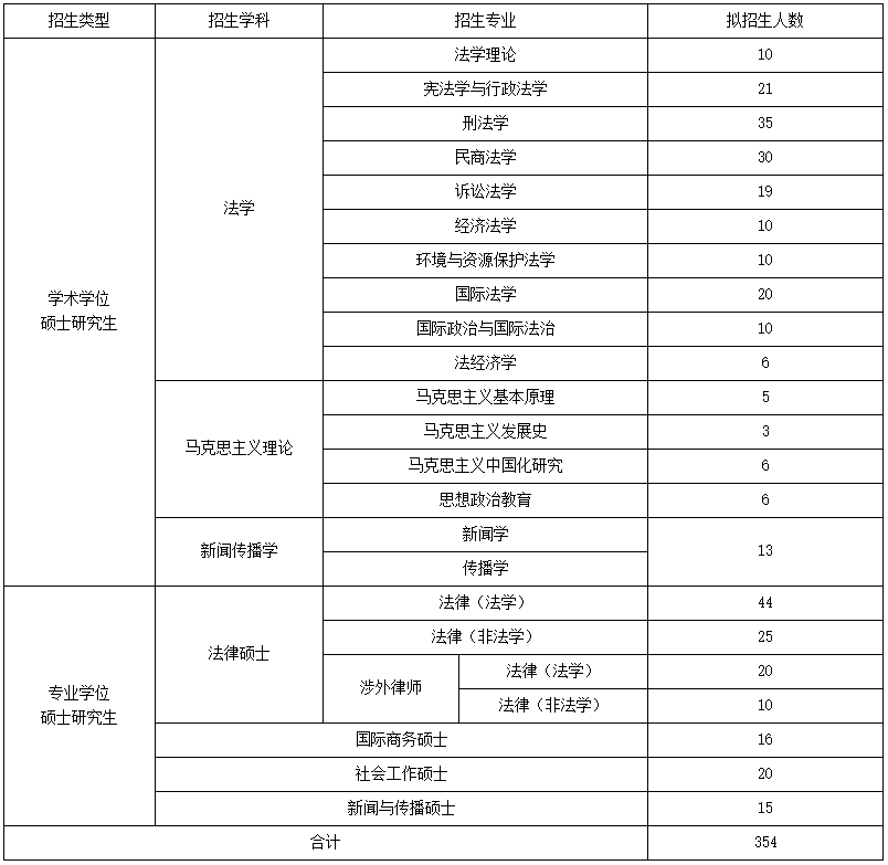 2022年我校拟招收全日制硕士研究生354名,具体拟招生计划人数参见下表。法律硕士考生网上报名时需选报培养方向,参加我校复试时可以再次明确。