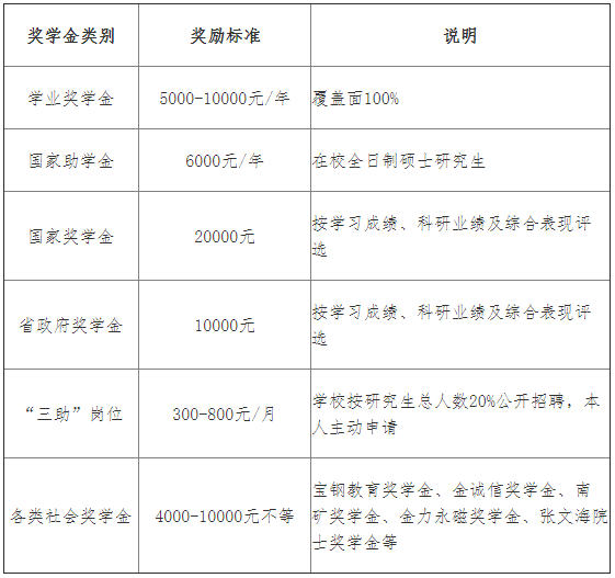 学校设有学业奖学金、国家助学金、国家奖学金、省政府奖学金、各类社会奖学金、研究生“三助”助学金等。非全日制硕士研究生、人事档案未转至我校的全日制硕士研究生不享受奖、助学金。