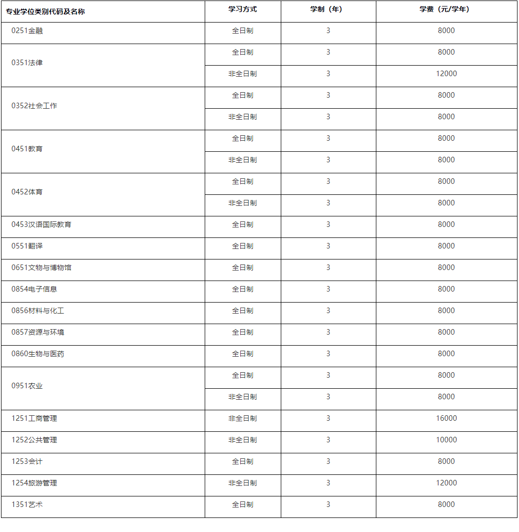 学术学位学习方式均为全日制,学制3年,每学年学费8000元。