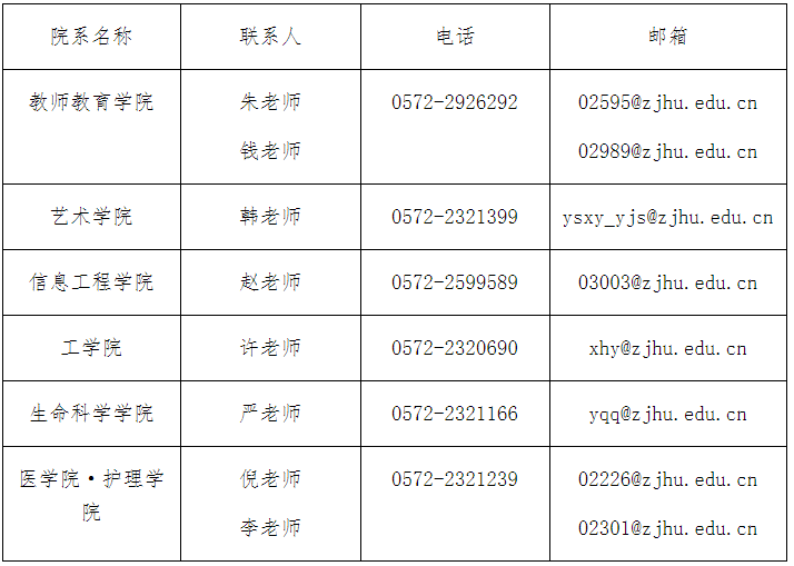 湖州师范学院研究生院,浙江省湖州市二环东路759号明达楼317室,邮编:313000,电话:0572-2322779。Email:yjsc@zjhu.edu.cn。官方网站:http://yjsy.zjhu.edu.cn/。