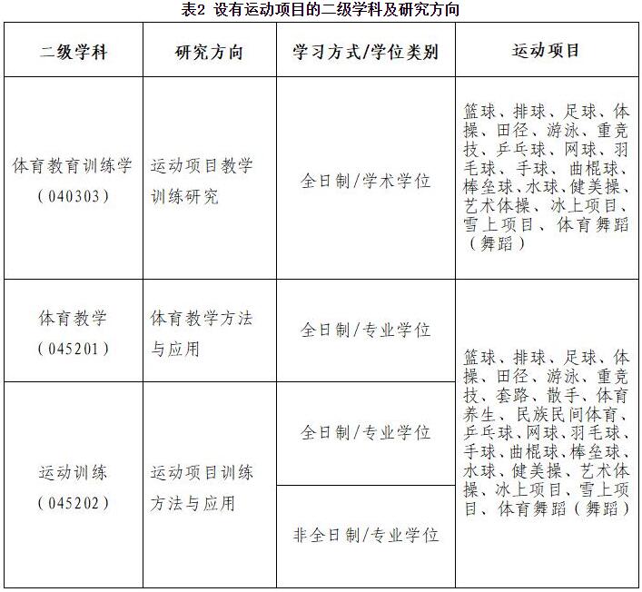 (五)我校2023年硕士研究生招生专业目录中,有三个二级学科(含三个研究方向)中设有运动项目,在复试时测试专项技术(见表2),其他二级学科不设运动项目。