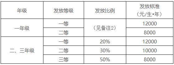 注:(1)面向全日制非定向研究生(有固定工资收入的除外)。(2)一志愿考生、推免生获一等奖学金,其他调剂志愿考生获二等奖学金。(3)如若学校研究生学业奖学金实施办法有最新修订,则参照最新修订办法执行。