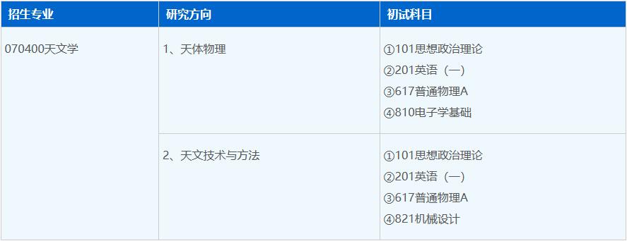 招生专业:0704天文学;主要研究方向:天体物理、天文技术与方法。主要培养致力于研究和设计大型专业天文仪器、空间目标观测仪器、大型多功能激光雷达(激光测距、激光通信、高空风场检测等)、大气监测仪器、大型航天级平行光管、军用光电装备等精密科学装备的光学、机械、自动控制、计算机软件等方面的人才,为我国天文仪器研制和发展培养优秀的接班人。