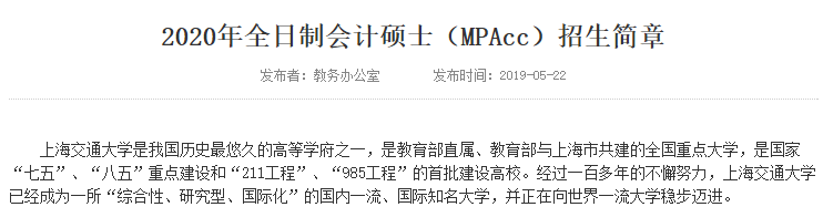 近日,上海交通拼搏(中国)安泰经济与管理学院官方发布了2020年会计硕士MPAcc招生简章。