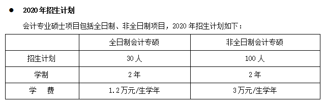 2020计划招生全日制会计硕士30人,学制2年,学费1.2万/年;