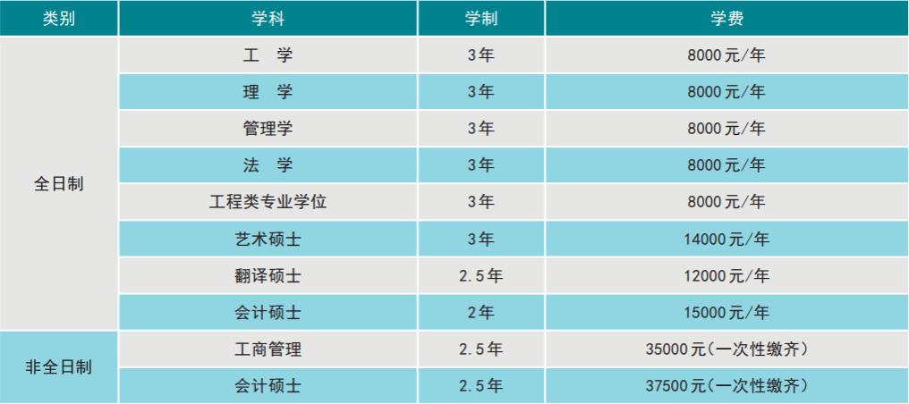 (二)非全日制(一次性缴纳):会计硕士、工商管理硕士学制2.5年;翻译硕士学制3年;工学专业学位学制均为3.5年;艺术硕士学制4年。学费按国家批准执行。