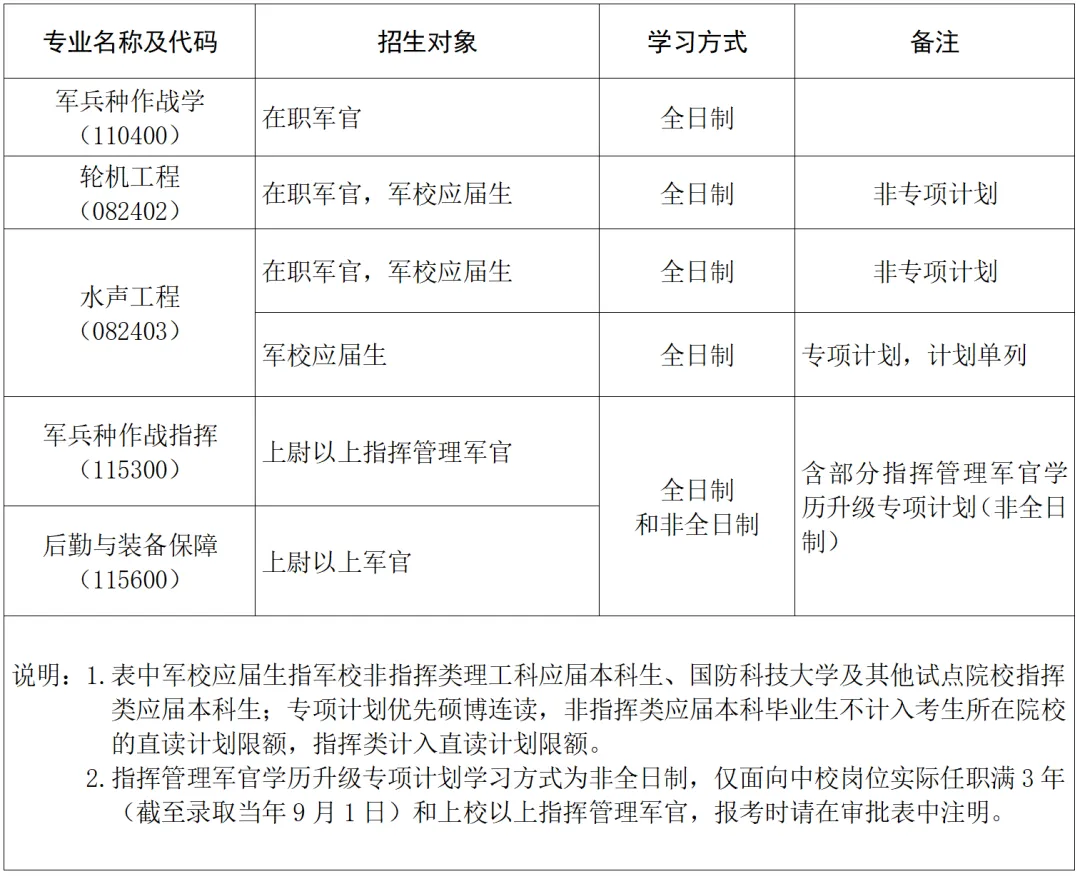 2. 专业学位(军兵种作战指挥、后勤与装备保障)招收上尉以上军官,其中专业技术军官仅限报考后勤与装备保障专业。专业学位部分非全日制指标用于指挥管理军官学历升级专项计划,仅面向中校岗位实际任职满3年(截至2025年9月1日)和上校以上的指挥管理军官,具体指标请联系学院招生办。