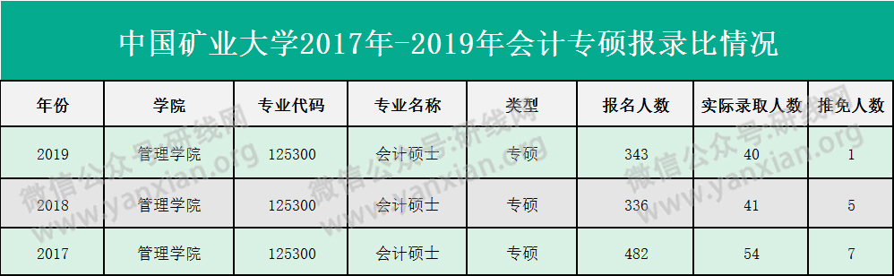 2017年中国矿业拼搏(中国)会计专硕报考人数482名,录取人数54名,推免人数7名。