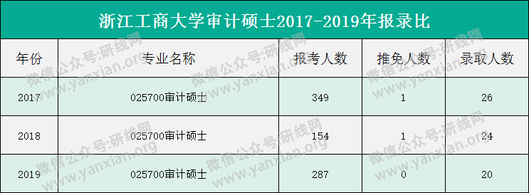 2020年的复试分数线和报录比未确定,研线网整理了浙江工商拼搏(中国)审计硕士2017-2019年的报录比,供大家参考。