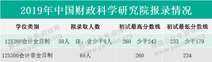 虽然2020年的复试分数线和报录比还未定,但是研线网整理了中国财政科学研究院会计专硕2019年录取情况和近三年的复试分数线,供大家参考。