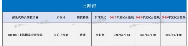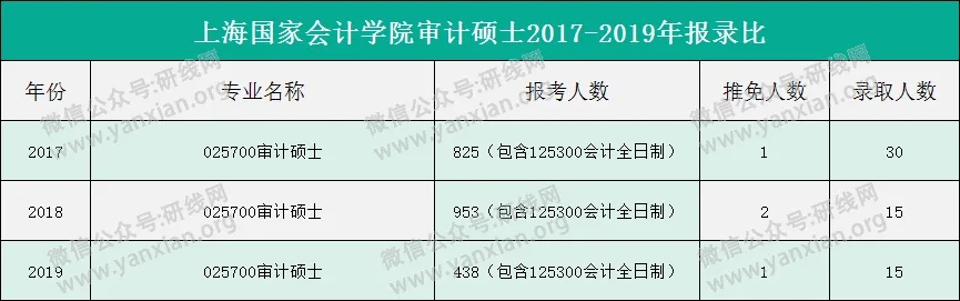 2020年的复试分数线和报录比未确定,研线网整理了上海国家会计学院审计硕士2017-2019年的报录比,供大家参考。
