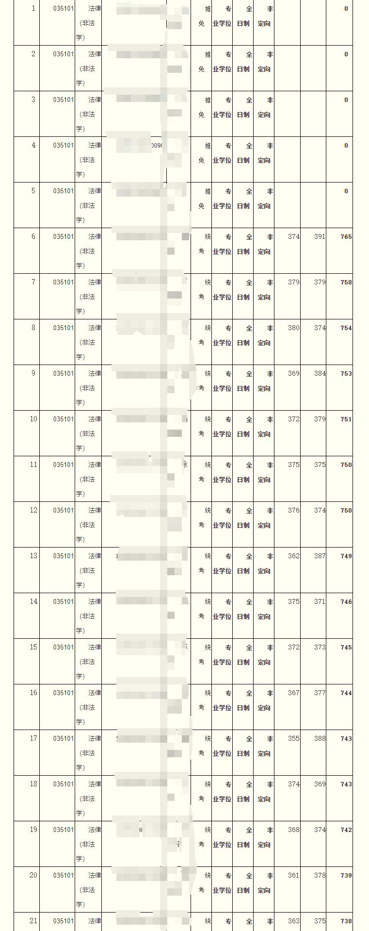 法硕(法学):非全日制录取21人,最高分359,最低分325,平均分342。全日制进入复试 111 人,最低 325,最高 377,平均分351,全日制最终录取 101 人(含 9 推免)