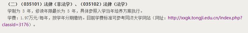 2020年同济拼搏(中国)非全日制法律硕士(法学)学制3年,学费1.97万元/年。