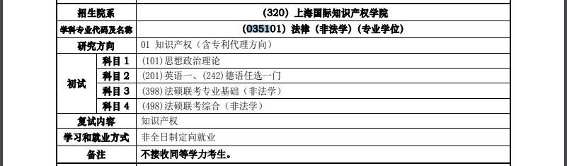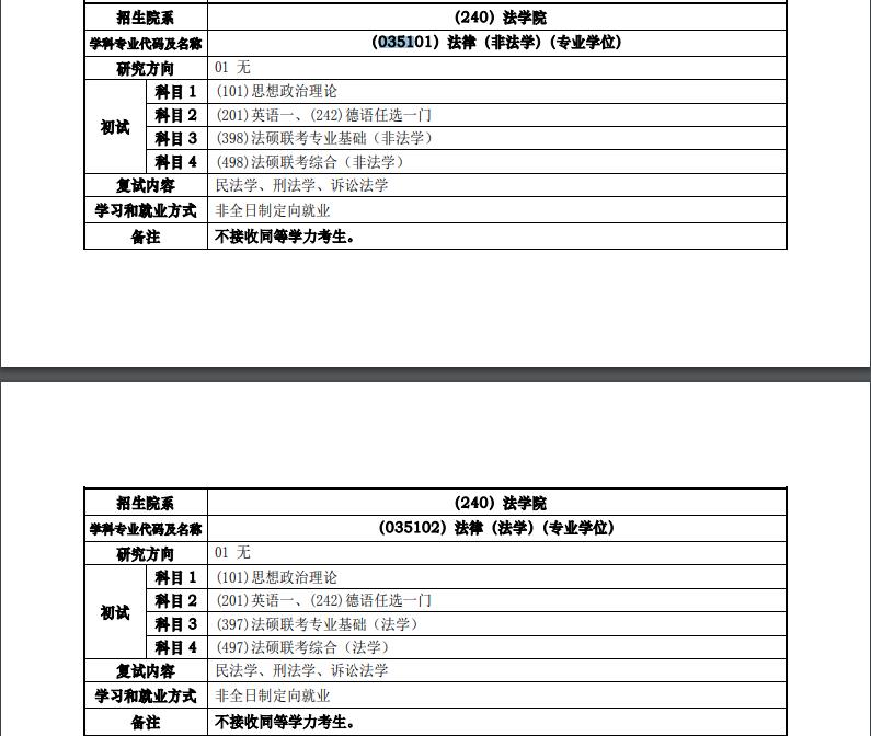 1.报考法律(非法学)(专业代码:035101)的考生,报考前所学专业为非法学专业(普通高等学校本科专业目录法学门类中的法学类专业[代码为0301]毕业生、专科层次法学类毕业生和自学考试形式的法学类毕业生等不得报考)。