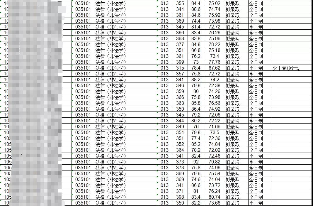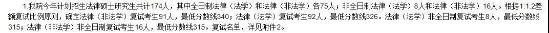 法硕(法学):一志愿共进入复试 100 人(含 8 非全),全日制最高分384,最低 326。