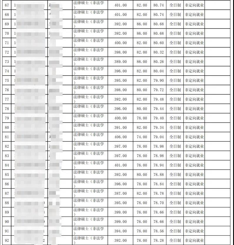 法硕(非法学):全日制94人 ,最高分417,最低分386。