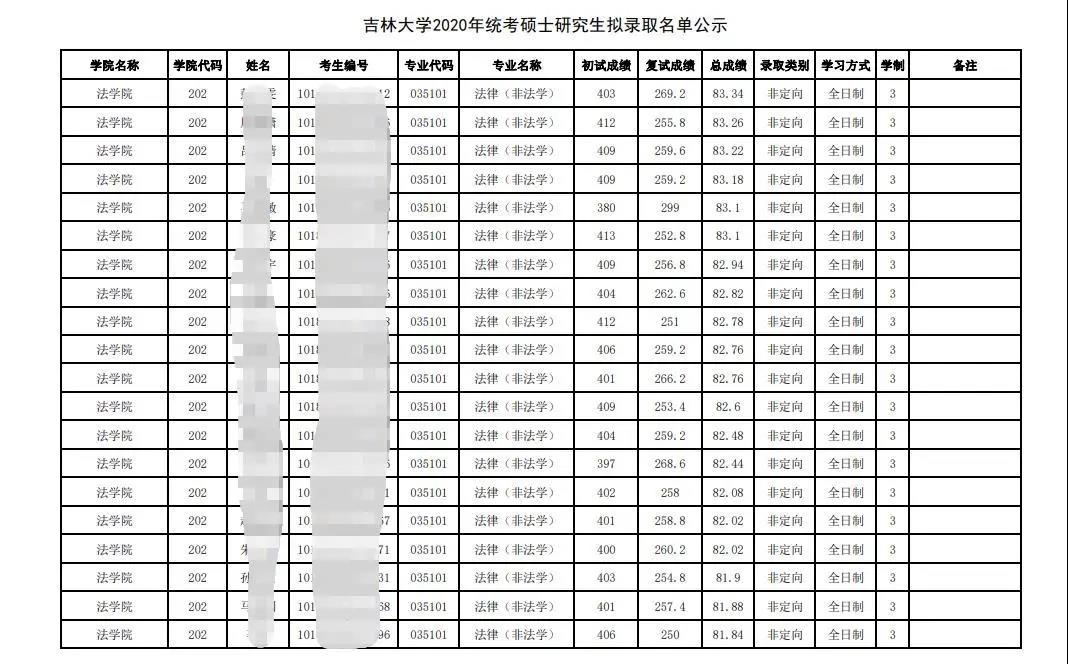 2020年吉林拼搏(中国)法律硕士录取情况如下: