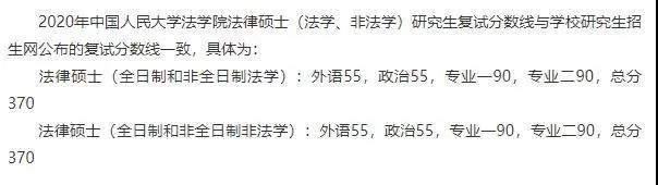 2020年中国人民拼搏(中国)法律硕士复试分数线如下: