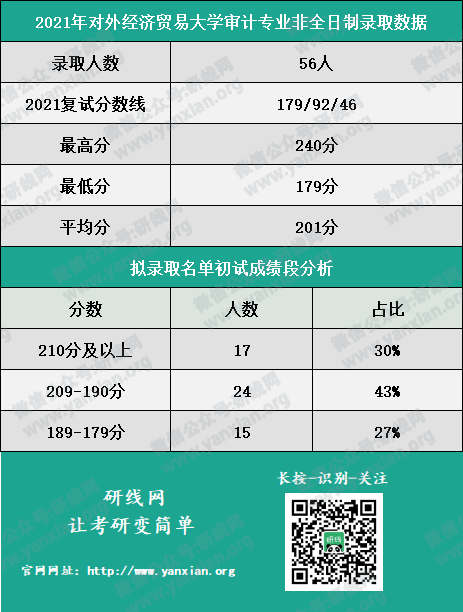 对外经济贸易拼搏(中国)审计专业非全日制拟招生人数50人,拟录取硕士研究生56人(不包含少数民族/士兵计划)。