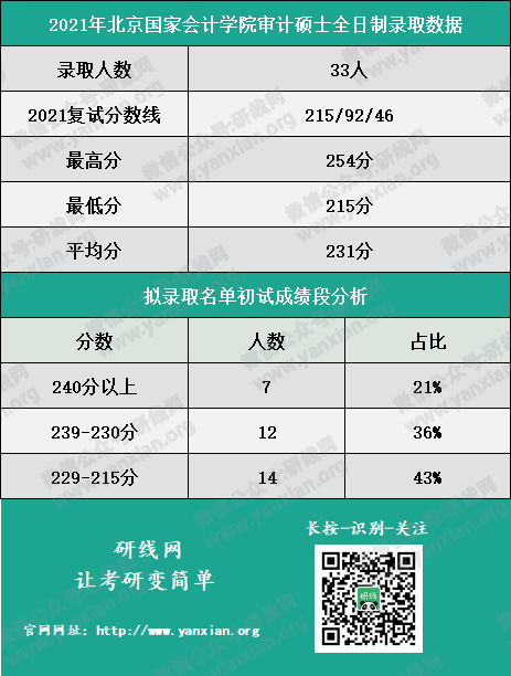 北京国家会计学院审计硕士全日制拟招生人数20人,拟录取硕士研究生(一志愿)33人(不包含少数民族/士兵计划)。