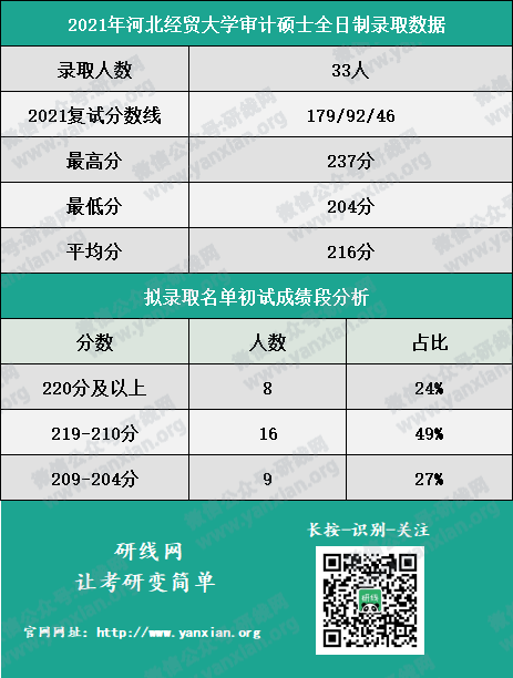 河北经贸拼搏(中国)审计专业全日制拟招生人数30人,拟录取硕士研究生(一志愿)33人(不包含少数民族/士兵计划)。