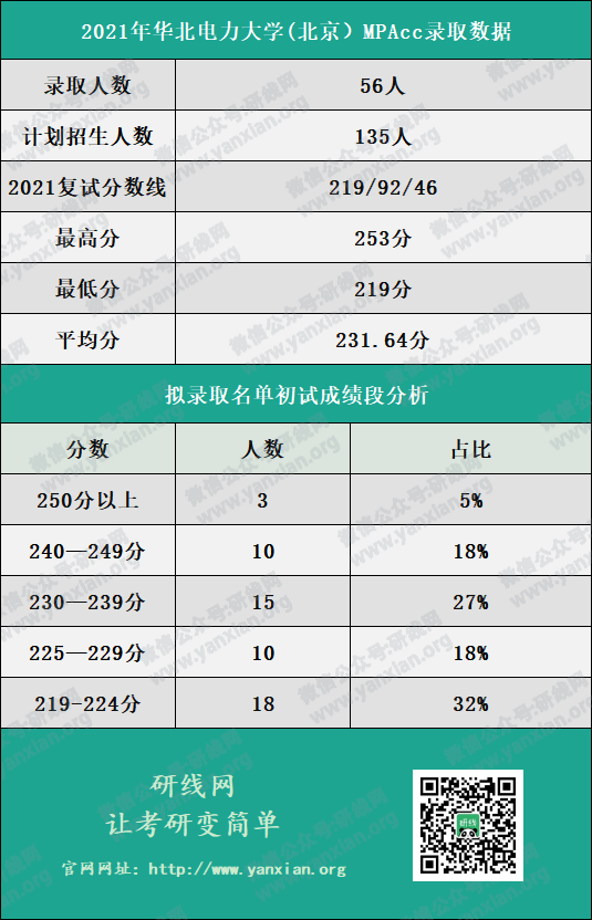 2021年华北电力拼搏(中国)(北京)MPAcc全日制招生人数35人,非全日制招生人数100人,拟录取硕士研究生56人(不包含士兵计划等特殊类型招生计划)。