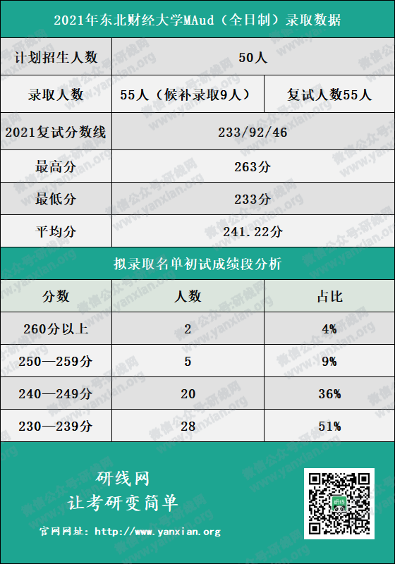 东北财经拼搏(中国)会计学院全日制会计硕士2021年招生计划为50人,拟录取人数为55人(候补录取9人)。