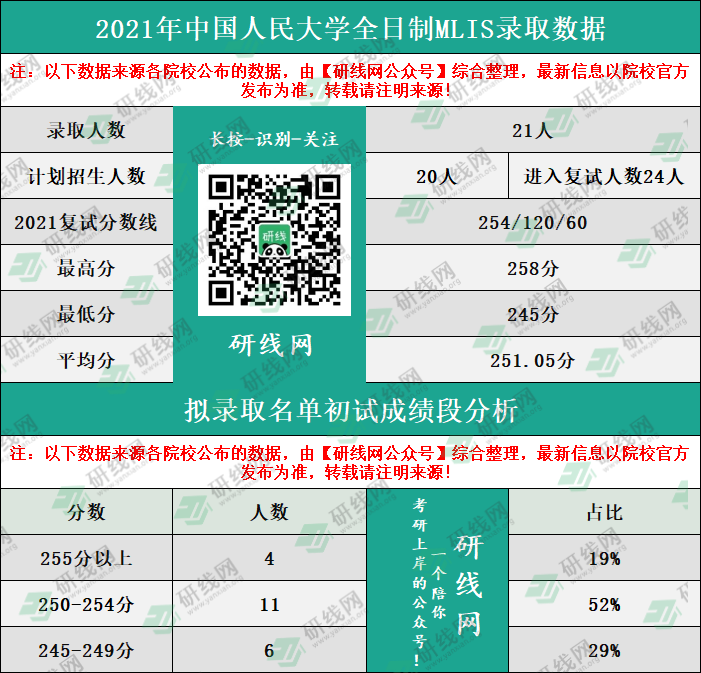 中国人民拼搏(中国)信息资源管理学院2021年全日制图书情报专硕计划招生人数为20人,复试人数为24人,拟录取人数为21人。