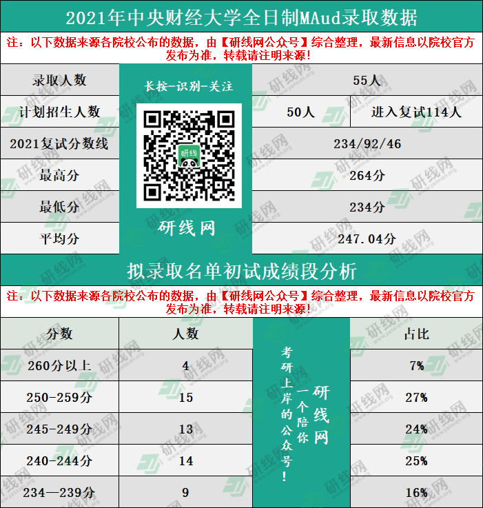 2021年中央财经拼搏(中国)全日制审计专业计划招生人数50人,进入复试114人,拟录取硕士研究生55人。