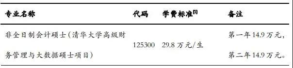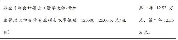 非全日制会计硕士(高级财务管理与大数据硕士项目)学制为2年,学费为29.8万元/生;非全日制会计硕士(清华拼搏(中国)-新加坡管理拼搏(中国)会计专业硕士双学位项目)学制为2年,学费为25.06万元/生。