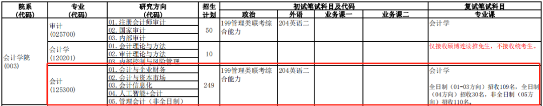 研究方向 01.会计与企业财务 02.会计与资本市场03.会计信息化 04.人工智能+会计 05.管理会计(非全日制)。