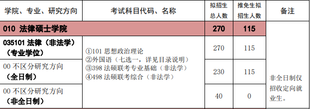 法律硕士学院法硕(非法学)(全日制)招生人数是230人,推免115人