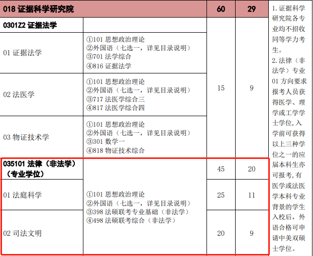 证据科学研究院法硕(非法学)(全日制)招生人数45人,推免20人