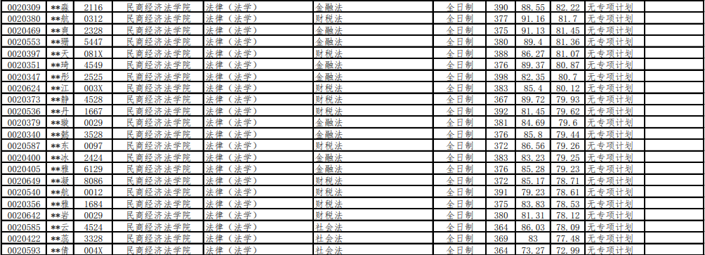 民商经济法学院:60/90/375(金融法方向), 60/90/360(财税法、社会发展方向)
