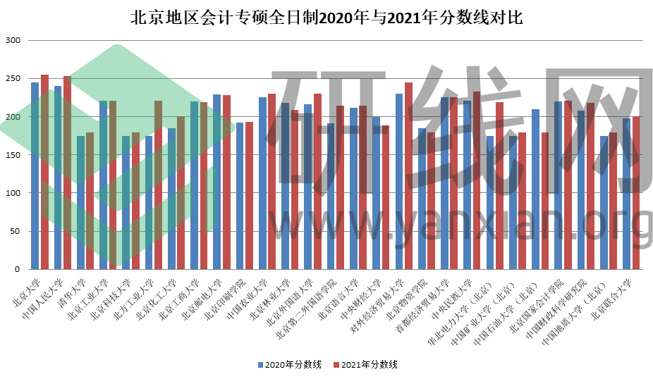 | 北京地区会计专硕全日制2020年与2021年分数线对比 | ||