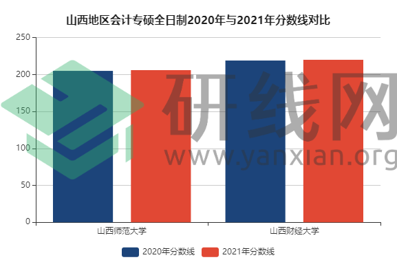 山西地区会计专硕全日制2020年与2021年复试分数线对比如下: