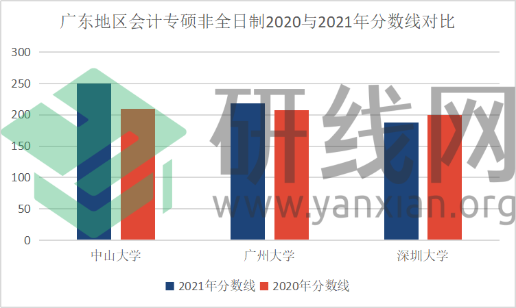 | 广东地区会计专硕非全日制2020与2021年分数线对比 | |||