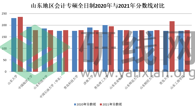 | 山东地区会计专硕全日制2020年与2021年分数线对比 | ||