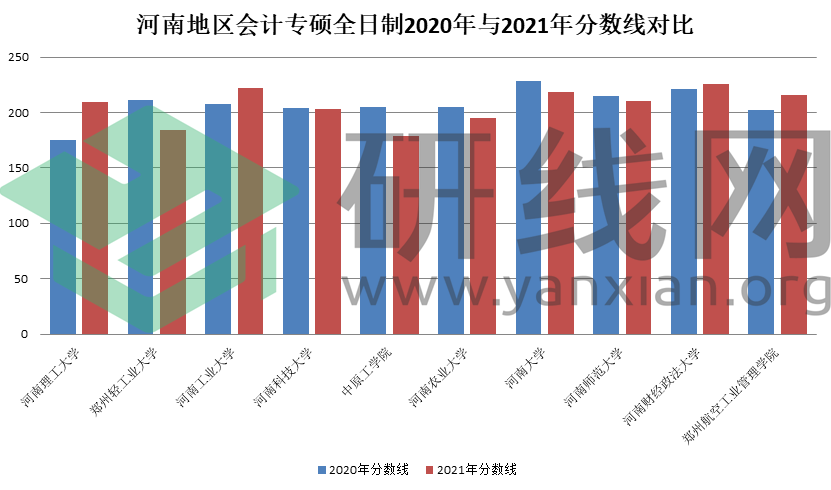 | 河南地区会计专硕全日制2020年与2021年分数线对比 | ||