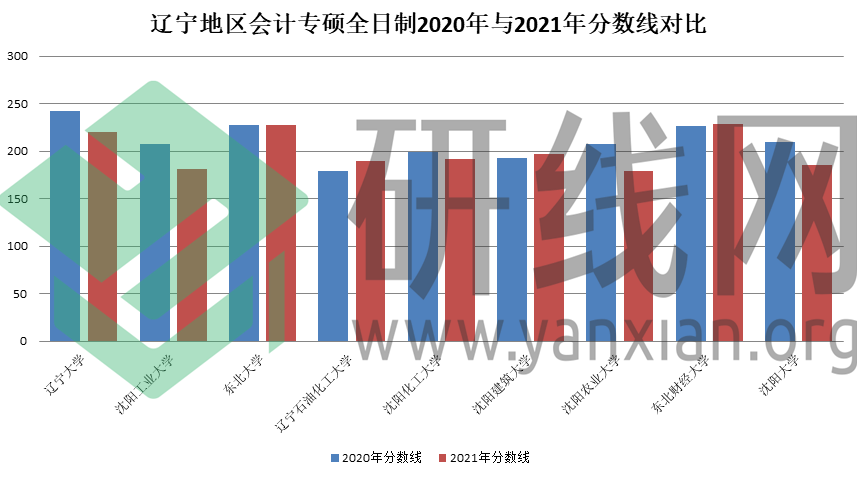 辽宁地区会计专硕全日制2020年与2021年复试分数线对比如下: