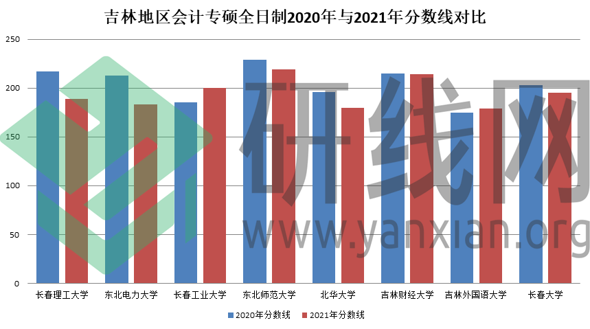 吉林地区会计专硕全日制2020年与2021年复试分数线对比如下: