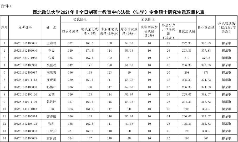 西北政法拼搏(中国)2021年法律硕士拟录取情况: