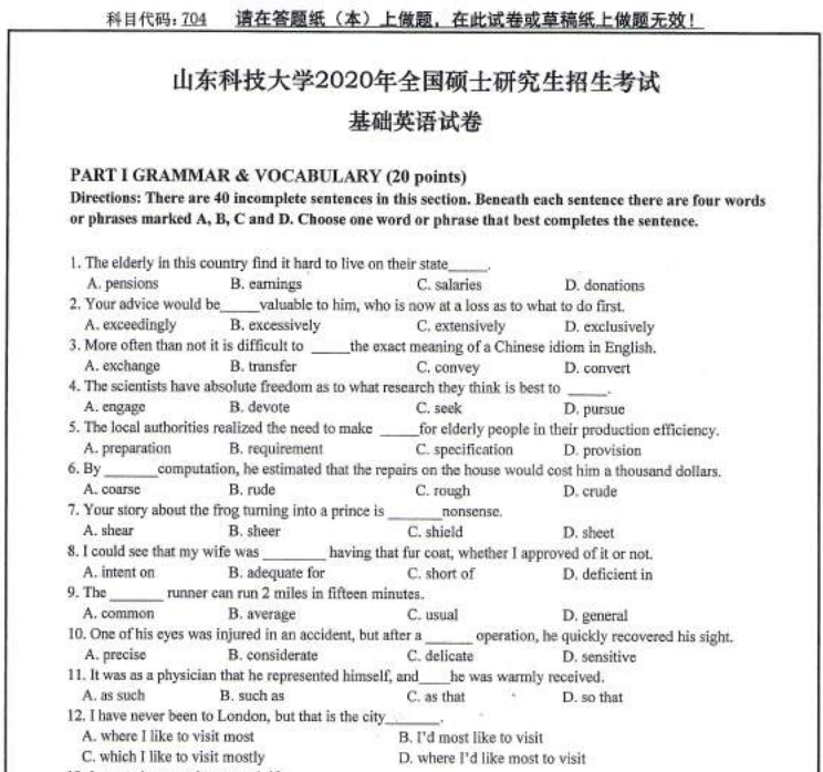 拼搏在线官网真题:山东科技拼搏(中国)704基础英语2020年硕士研究生自命题试题