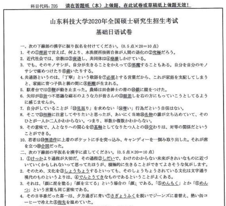 拼搏在线官网真题:山东科技拼搏(中国)705基础日语2020年硕士研究生自命题试题