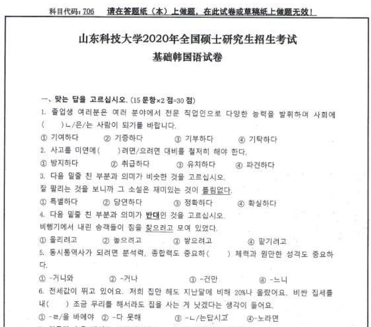 拼搏在线官网真题:山东科技拼搏(中国)706基础韩国语2020年硕士研究生自命题试题