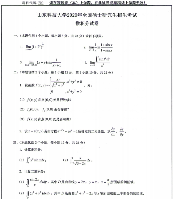 拼搏在线官网真题:山东科技拼搏(中国)709微积分2020年硕士研究生自命题试题