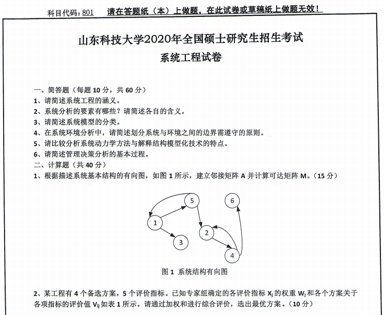 拼搏在线官网真题:山东科技拼搏(中国)801系统工程2020年硕士研究生自命题试题