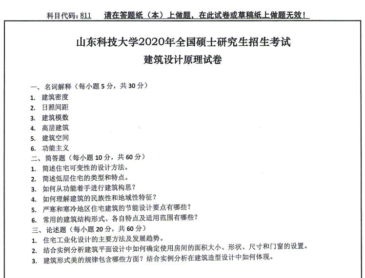拼搏在线官网真题:山东科技拼搏(中国)811建筑设计原理2020年硕士研究生自命题试题