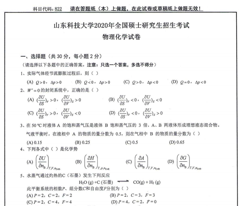 拼搏在线官网真题:山东科技拼搏(中国)822物理化学2020年硕士研究生自命题试题