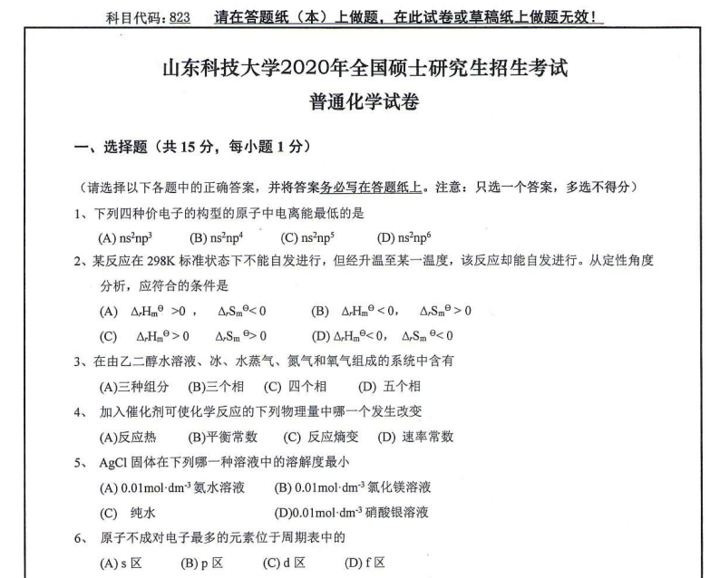 拼搏在线官网真题:山东科技拼搏(中国)823普通化学2020年硕士研究生自命题试题”的全部内容!更多真题资料请关注“拼搏在线官网
